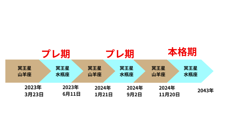 けれども、いきなり変わるのではなくて、生き方を選択できる期間があります。途中、プレ期というのがあって、冥王星が一旦土の時代のやぎ座にもどり、また水ガメ座にもどりを繰り返します。